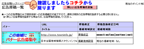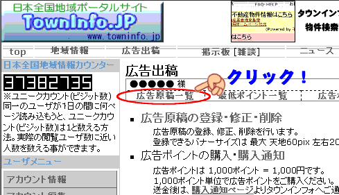 登録済み広告原稿バナー確認1. 広告出稿TOP画面の【広告原稿一覧】をクリック