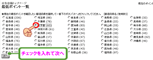 2. 確認したい地域の属する都道府県にチェックを入れて「次へ」をクリック
